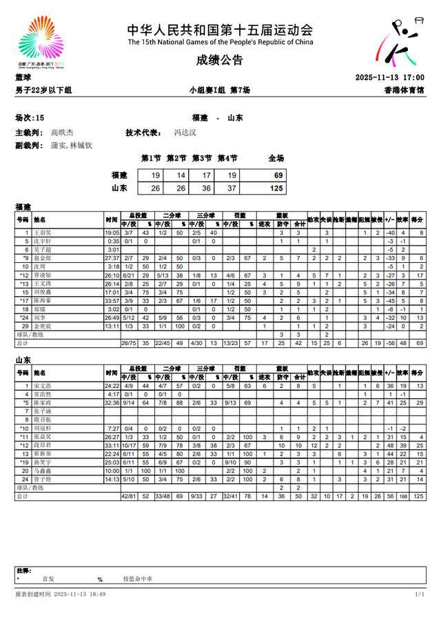 你以为领先那么多,山东队就会敷衍了事了吗?答案是都否定的!山东队的小伙子依旧火力全开,把分差从40+扩大到了50+,丝毫不给福建队反扑的机会。不得不说,巩晓彬带队之下,山东队的小伙子还真就是没有一个敢松懈的。最终,山东队凭借末节打成37-19,以125-69大胜福建56分,轻松斩获3连胜,锁定一个8强席位。